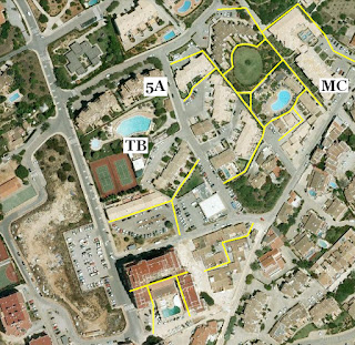 This map is distorted but the yellow point is the Tapas one and only sort of club house entrance  and the blue one is the main reception entrance on the right of which is the access to the creches.